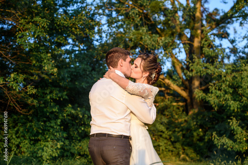 © Nestyda, Fototapeta premium Bride and groom kissing and holding hands in the forest on nature