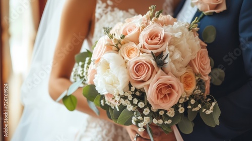 Naklejka premium bride and groom wedding couple with a bouquet of light rose and white color...