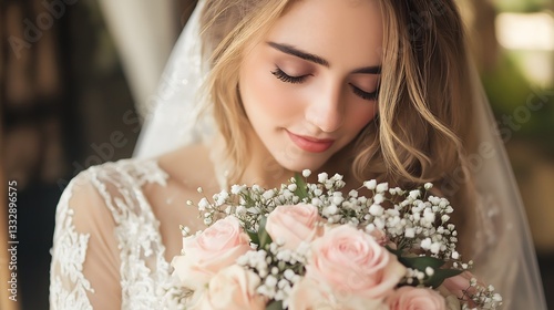 Naklejka premium Bride holding a beautiful bouquet of roses with delicate flowers while wearing an elegant wedding dress and veil indoors