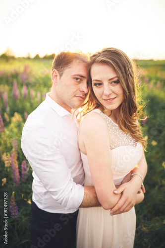 Fototapeta premium Bride holds groom's neck while he kisses her in the rays of sunset