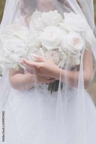 © Stanislav, Naklejka premium bride in a white dress with a chic bouquet in her hands. Luxury wedding bouquet. The girl is holding flowers - roses, peonies, archedes.