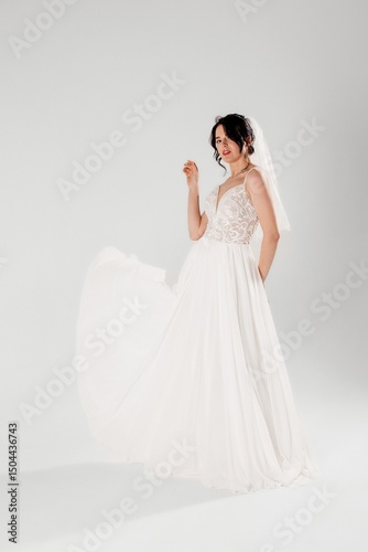 Fototapeta premium Bride in elegant white dress with flowing fabric poses gracefully in studio...
