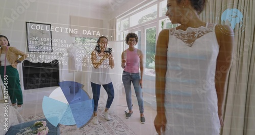 © vectorfusionart, Naklejka premium Bride in white lace dress posing in living room with women holding tape, data-overlay, copy space