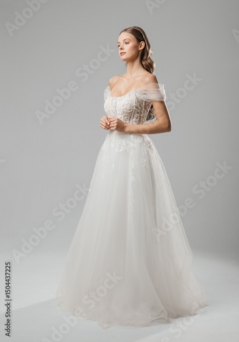 © Svetlana, Fototapeta premium Bride models an elegant wedding dress in a studio with neutral background during photoshoot session showcasing delicate lace details