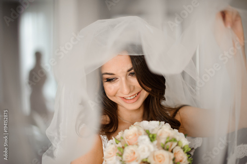 © fesenko, Naklejka premium Bride morning preparation. Attractive and smiling bride in a white veil with a wedding bouquet