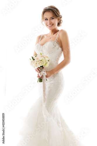 © inarik, Naklejka premium Bride Wedding Dress holding Flower Bouquet. Bridal Beauty Woman Fashion Portrait. Isolated White Background