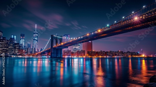 Fototapeta premium "Bridge at Night Over City River Skyline