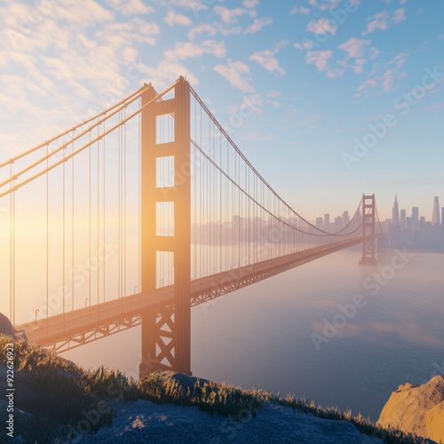 © Kasa_s, Obraz premium Bridge at sunrise with the city skyline in the background