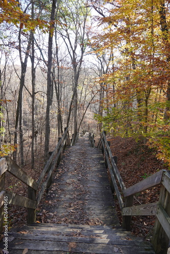 © April, Obraz premium Bridge leading down the mountain side surrounded by trees inviting the cool fall wind