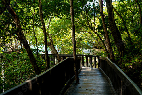 © Natalia, Obraz premium Bridge made of wood that leads to nature.