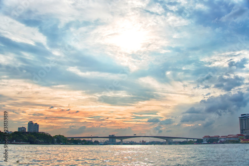 © athitat, Naklejka premium Bridge on the river with background sunset sky