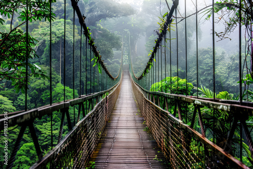 © Алла Морозова, Obraz premium Bridge over a forest with a green canopy. The bridge is made of metal and is suspended over a river. The bridge is surrounded by trees and plants, giving it a natural and serene atmosphere