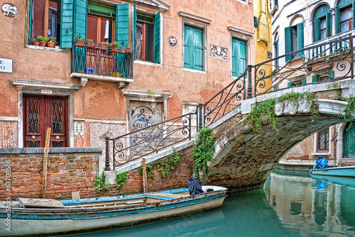 Fototapeta premium Bridge over a small canal, colorful and picturesque street in Venice, Italy