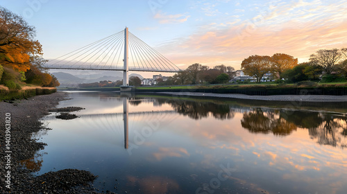 © Sujito, Naklejka premium Bridge Over Calm River At Sunrise