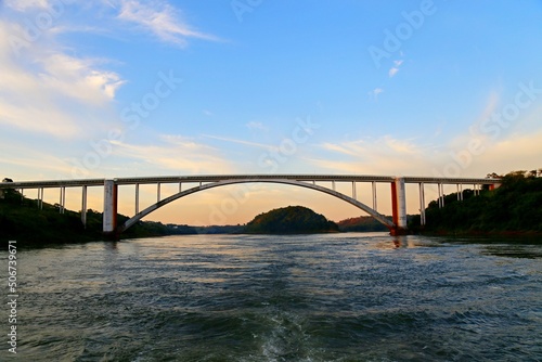 Fototapeta premium Bridge over the Iguacu River on the border between Brazil and Paraguay. Arch bridge over the waters of the river and an island in the background. Dusk sky.