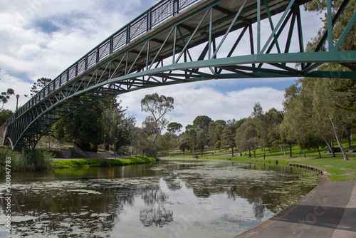 Naklejka premium Bridge over the river in the city park surrounded by green trees, cityscape