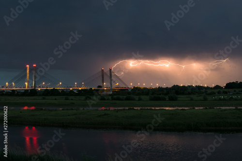© Menyhert, Obraz premium Bridge over the river "Waal" in The Netherlands while a horizontal lightning bolt travels through the sky.