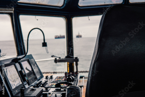 © Igor Kardasov, Obraz premium Bridge ship equipment of ffshore dp vessel thruster pitch propellers telegraph handles vhf radio, navigation devices