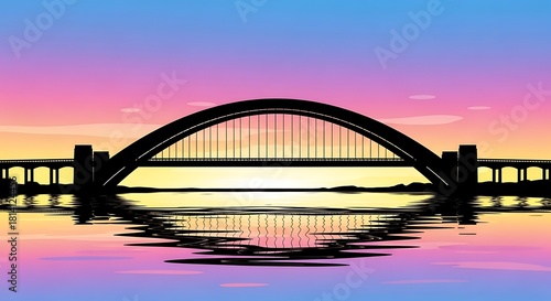 © Nurul, Naklejka premium Bridge Silhouette at Sunset Reflected in Water with Gradient Sky Design