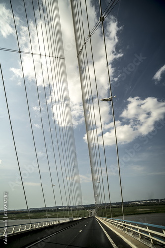 © ANDREY, Naklejka premium bridge, sky, architecture, blue, cable, road, city, train, railway, speed, travel, rail, station, traffic, transport, night, steel, building, construction, transportation, structure, river, abstract,
