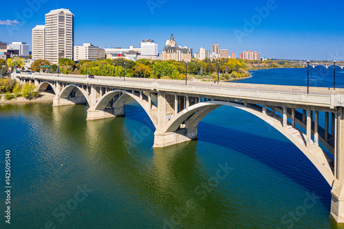 © Scott Prokop, Naklejka premium Bridge spans a river with a city in the background