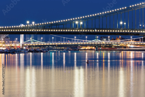 © Yury Kirillov, Naklejka premium Bridges over Danube river in Budapest at night