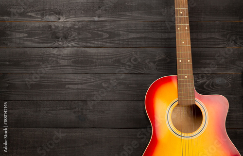 Obraz premium Bright acoustic guitar on wooden background, top view