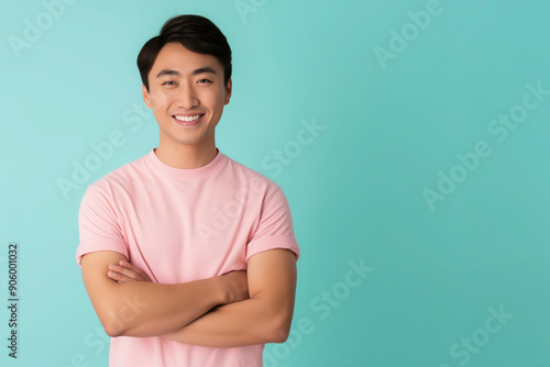 © Nadia Do, Obraz premium Bright advertising mock-up photo of a young asian man with his arms crossed wearing a pink t-shirt, turquoise blue background