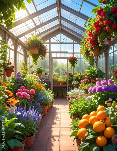 Obraz premium Bright, airy greenhouse filled with various colorful flowers
