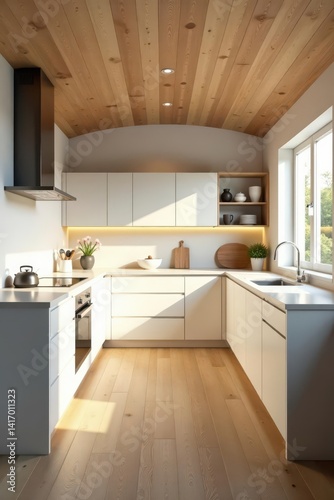 Fototapeta premium Bright airy kitchen, curved ceiling, natural wood, white cabinets , airy...