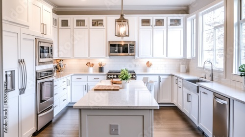 Fototapeta premium Bright and airy kitchen with white cabinets, stainless steel appliances, and...