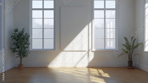 © Nathan, Obraz premium Bright and airy minimalist room interior with sunlight streaming through windows, featuring a blank canvas and potted plants