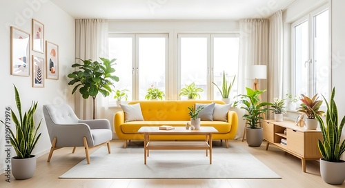 Fototapeta premium Bright and airy modern living room featuring a vibrant yellow sofa and lush plants.