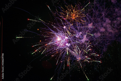© Artsiom P, Fototapeta premium Bright and beautiful festive fireworks of yellow and lilac color, with haze, in the night sky