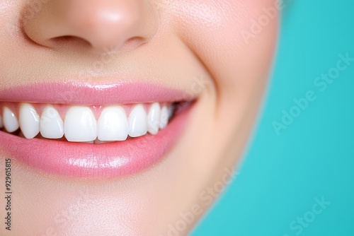 © TeteraX, Obraz premium Bright and cheerful smile of a woman against a teal background during daylight