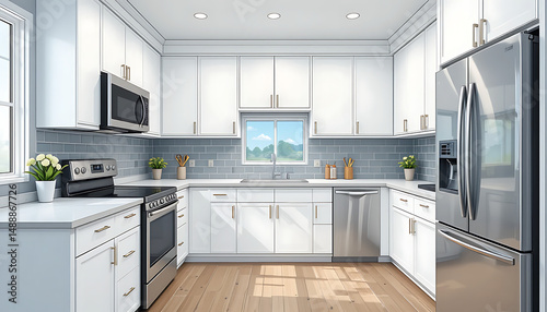 © Alex, Fototapeta premium Bright and clean modern kitchen with wood cabinets, stainless steel appliances, and natural light from a window with scenic outdoor view.