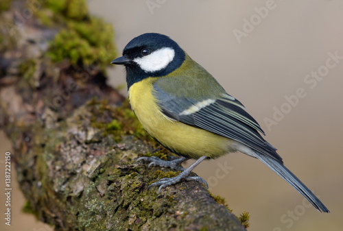 Fototapeta premium Bright and colorful adult Great tit (Parus major) posing on a big stick of mossy wood