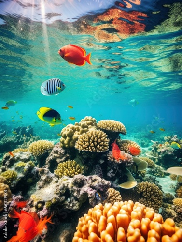 Fototapeta premium Bright and colorful underwater world, fishes and plants life on the...