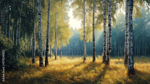© Dilruba, Fototapeta premium Bright and fresh morning in the forest, where sunlight dapples the forest floor and birds