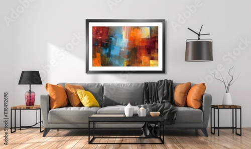 Fototapeta premium Bright and inviting living room showcases a captivating abstract artwork in a sleek frame. Cozy seating area with decorative pillows and stylish lighting creates a warm atmosphere