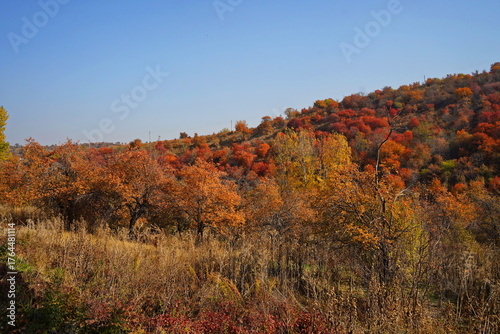 © Vladimir, Fototapeta premium Bright and juicy autumn leaves. Mountainous area with different trees, leaf fall. Magical autumn.
