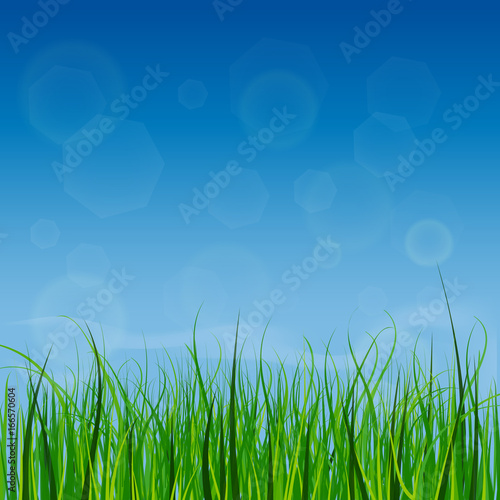 © Sergey T.., Obraz premium Bright and juicy green grass on a blue sky background. Morning.