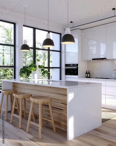 Fototapeta premium Bright and modern kitchen with island, natural light, and stylish decor perfect for contemporary home.