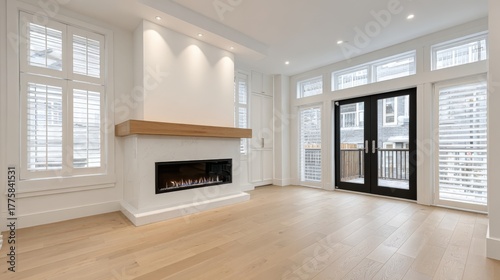 Naklejka premium Bright and Modern Living Room with Fireplace, Large Windows, and Hardwood Flooring in a Stylish Home