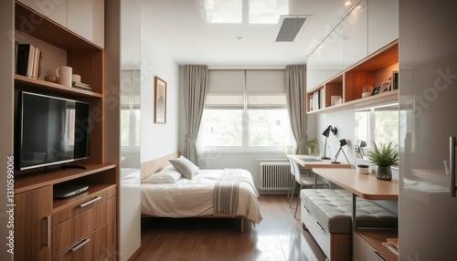 © Kitta Studio, Fototapeta premium Bright and Modern Minimalist Bedroom with Workspace and Natural Light