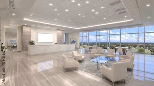 © Jack, Fototapeta premium Bright and Open Space: A well-lit meeting area with floor-to-ceiling windows and a blank white frame mounted on a polished wall.