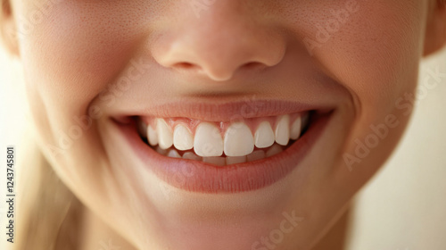 © Phudit, Fototapeta premium Bright and Radiant Smile of a Young Woman Featuring Healthy White Teeth and a Genuine Expression of Happiness Against a Soft Neutral Background