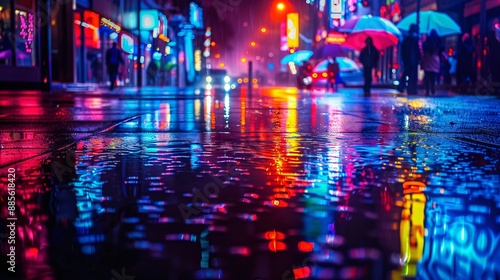 Obraz premium Bright and sharp photograph of a rainy night street scene with colorful neon...