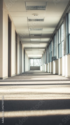Fototapeta premium Bright and Spacious Office Corridor With Large Windows Allowing Natural Light to Fill the Area During Daytime Hours