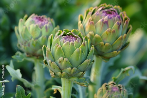 Fototapeta premium Bright artichokes against nature backdrop in twilight light.